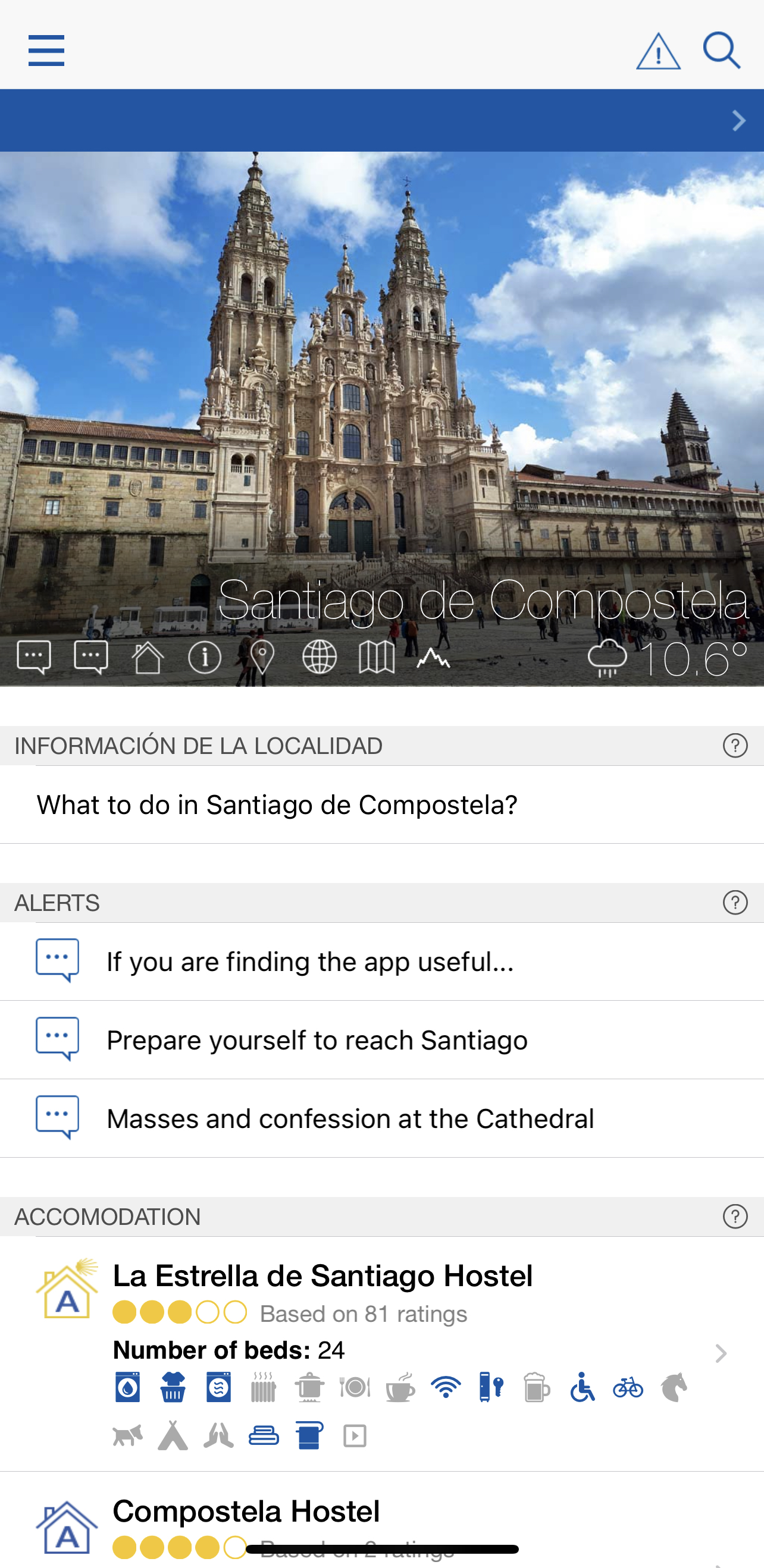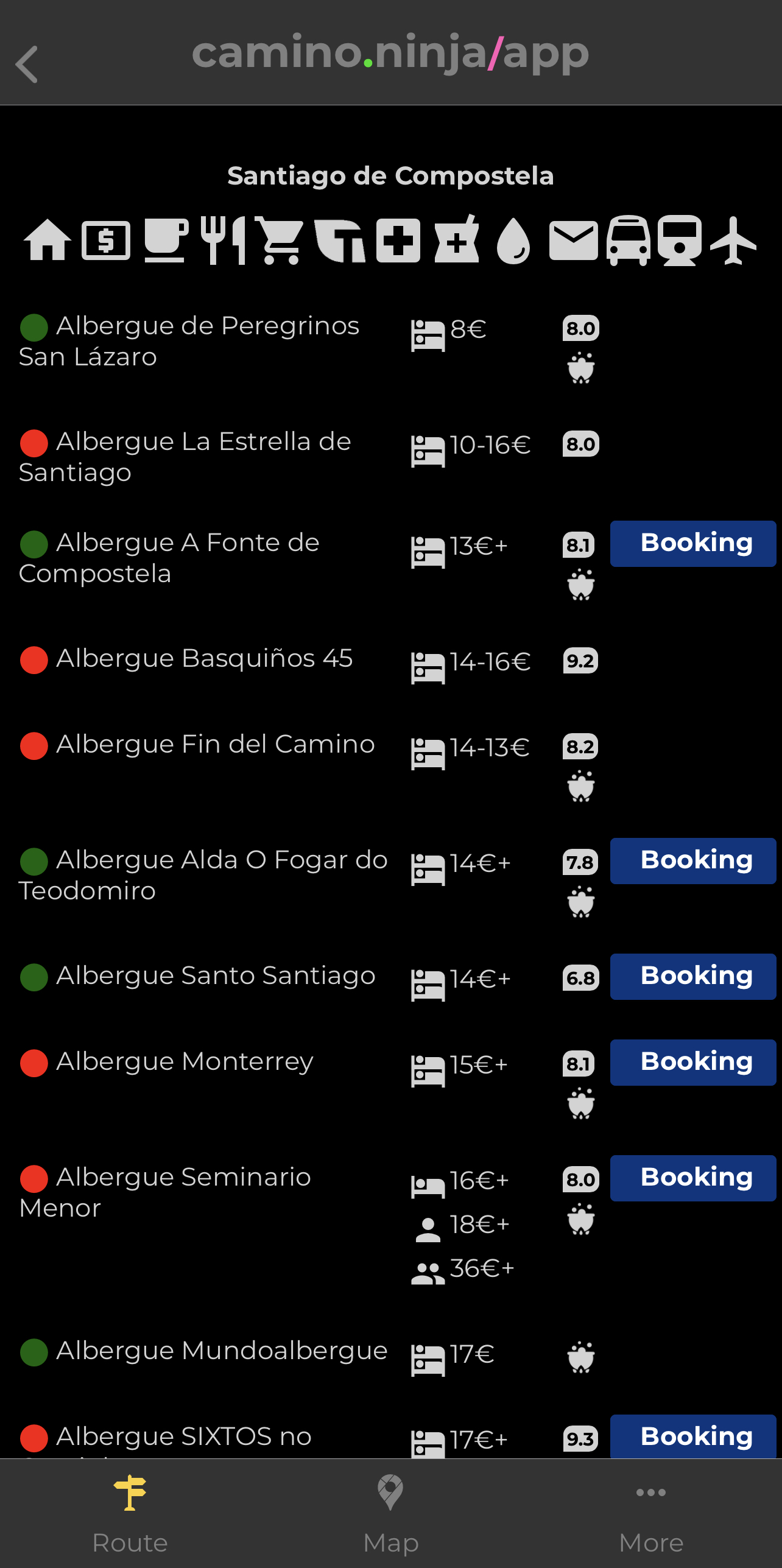 경로에서 원하는 지역을 누르면 그 지역의 알베르게 및 레스토랑 등 다양한 정보를 확인할 수 있어요