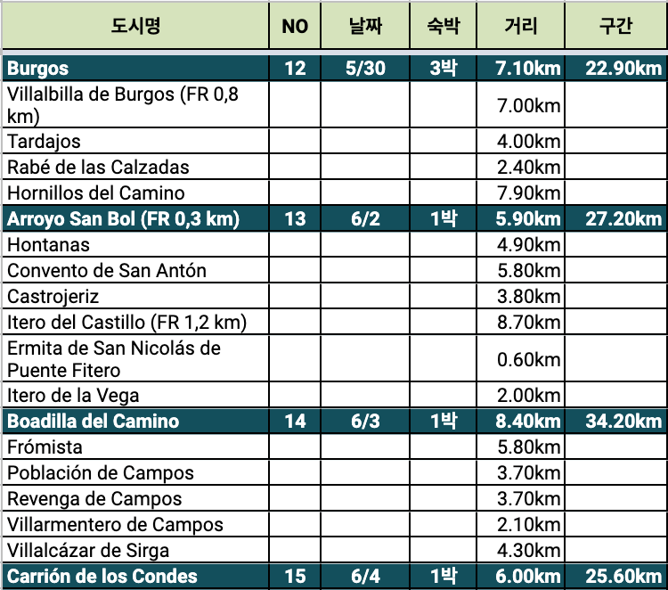 팜플로나에서는 짐 정리를 하느라 연박을 하고, 부르고스에서는 바다가 보고 싶어 잠시 걷기를 멈추고 빌바오로 여행을 다녀오기도 하고, 또 레온에서는 동행들을 기다리며 연박을 하는 등 때때로 걷기를 멈추는 날들이 있어서 실제로 걷는 날보다 전체 일정은 좀 더 길어졌어요. 시간적 여유가 있으신 분들은 일정을 조금 느슨하게 잡으시는 걸 권해드리고 싶어요.