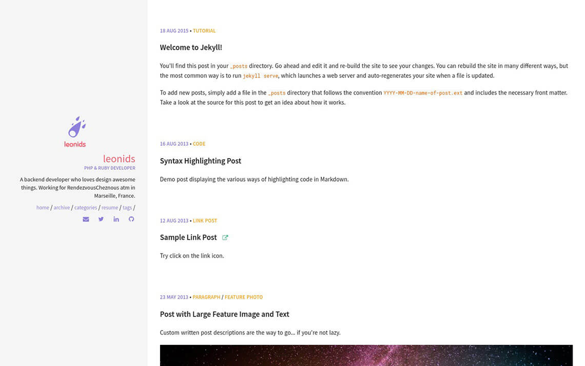 | Leonids Jekyll theme | Minimal Mistakes Jekyll theme | Online CV |