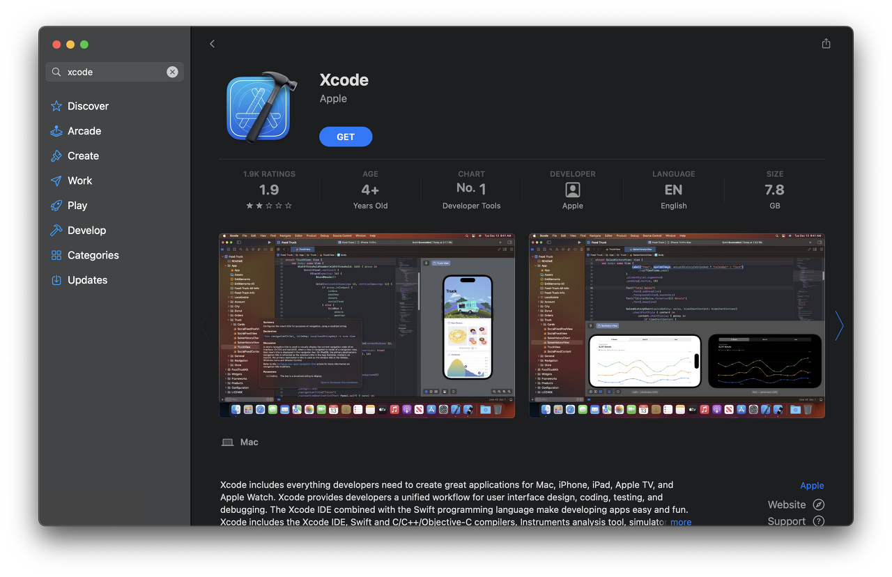 App Store에서 Xcode를 검색해서 설치를 진행합니다. 시간이 좀 걸리니 여유 있게 기다려주세요.